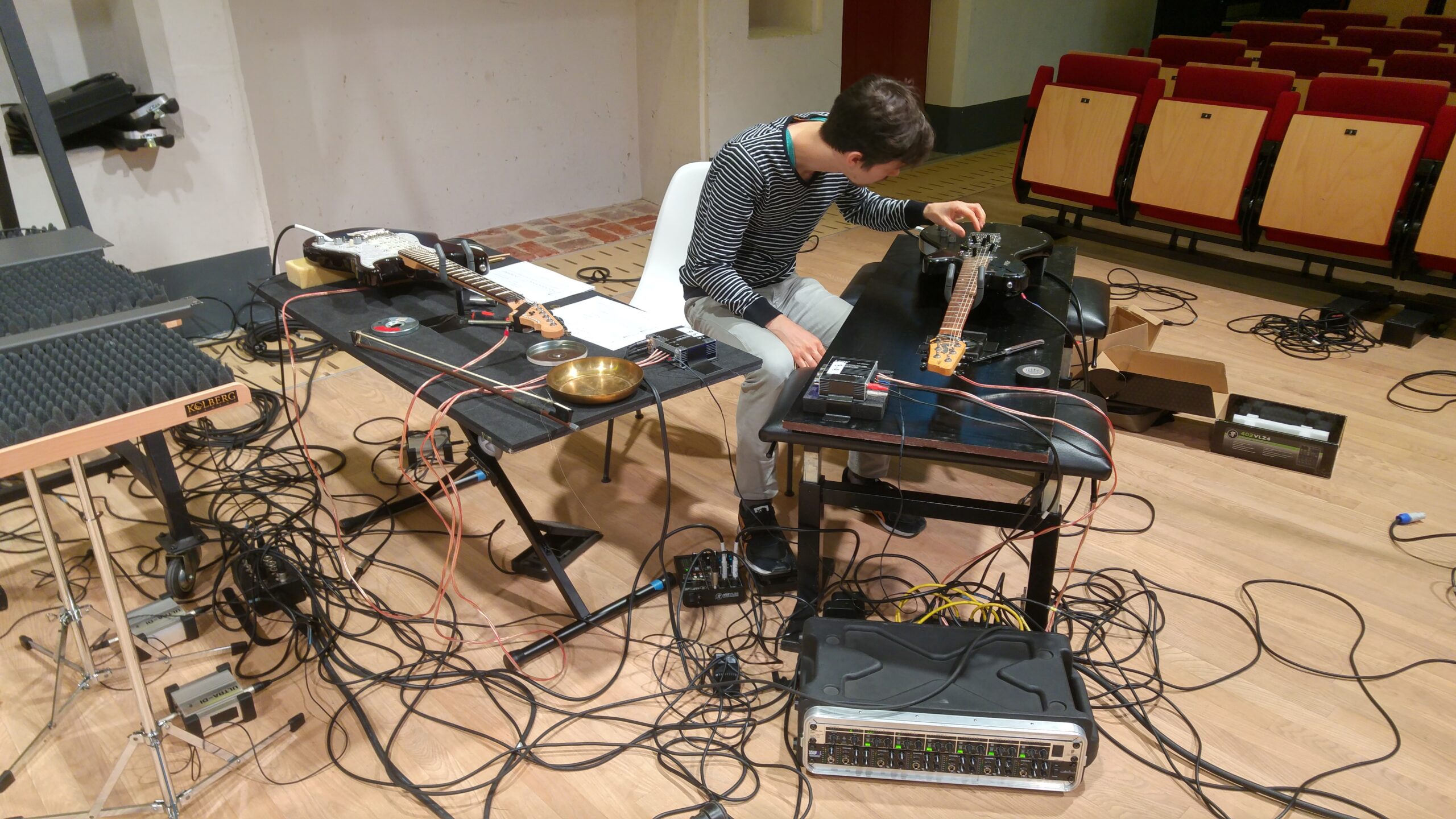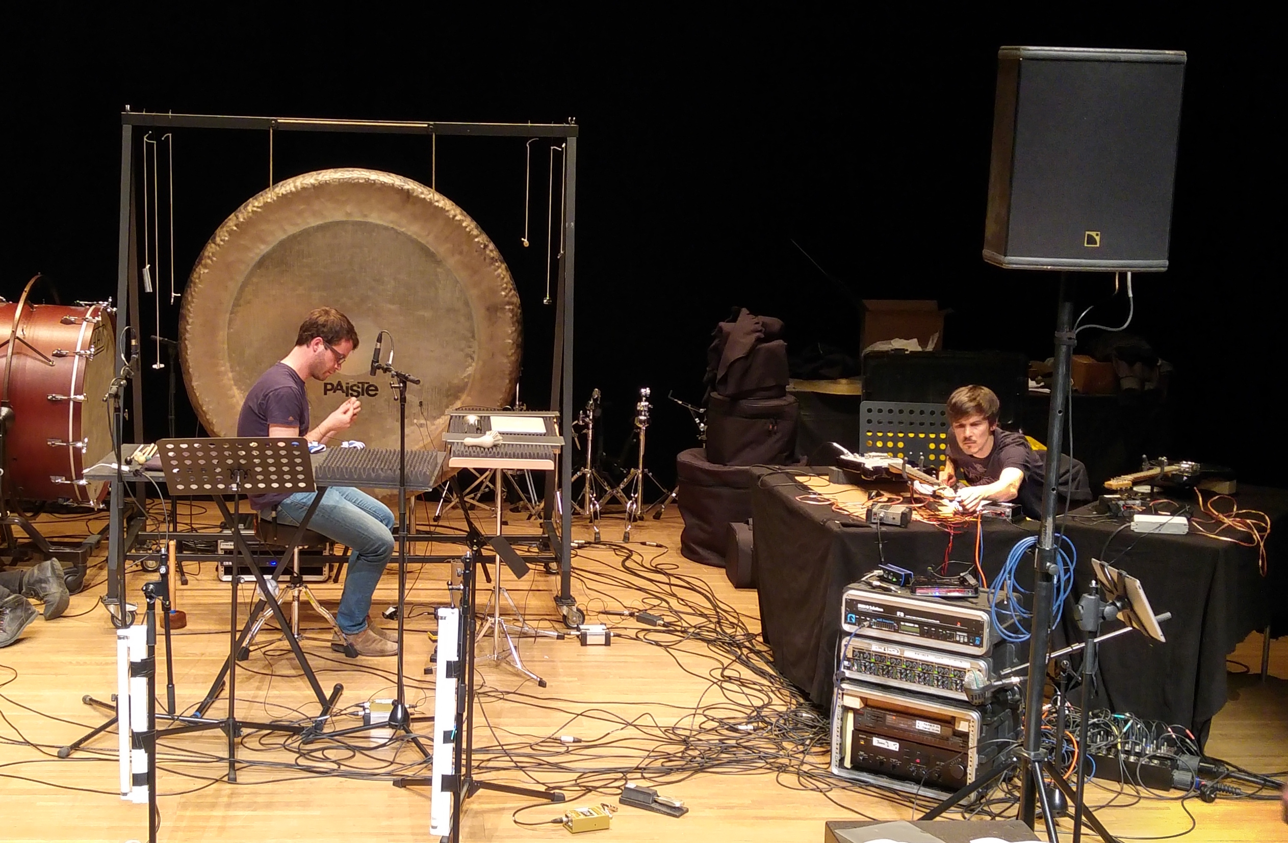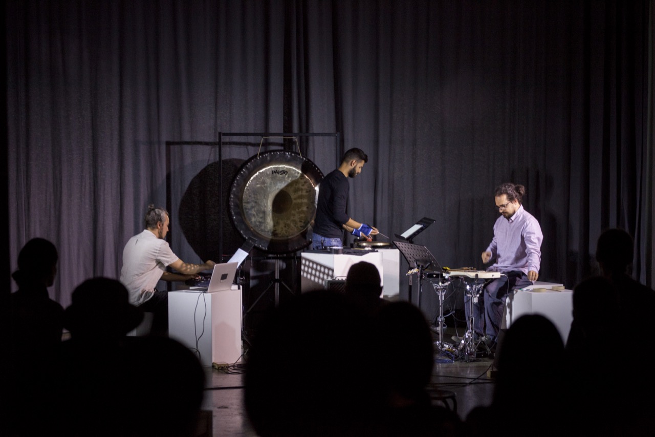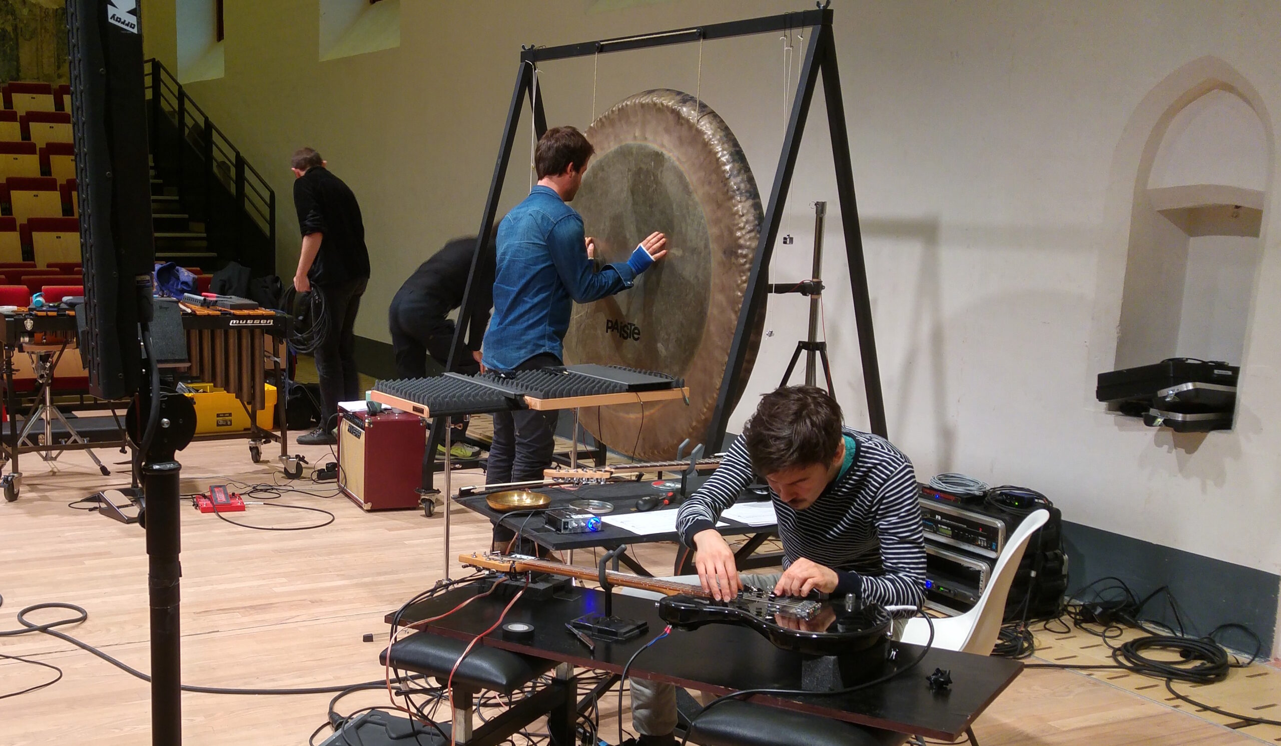 A trio for actuated tabletop electric guitars, tam-tam, and electronics. The instruments are augmented with DIY electro-mechanical systems that allow sustained sound through feedback. This setup alters the instruments’ behavior, bypassing traditional performance techniques and requiring a process of research of new modes of interaction together with the performers. The piece explores the instability of feedback as a compositional tool, where small physical changes in the setup, different instrument exemplars in the hands of different performers can produce radical sonic transformations.