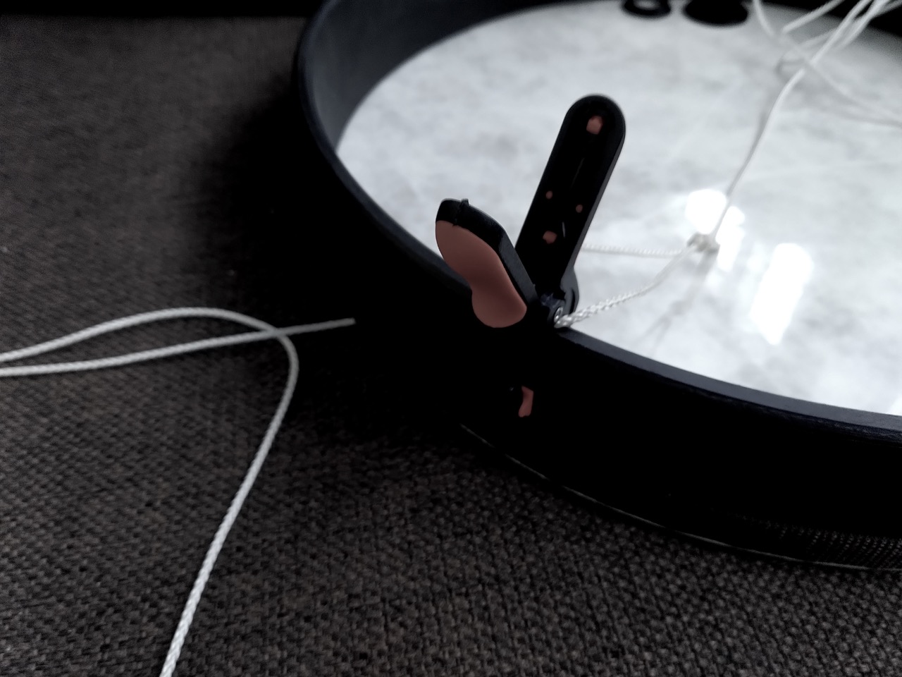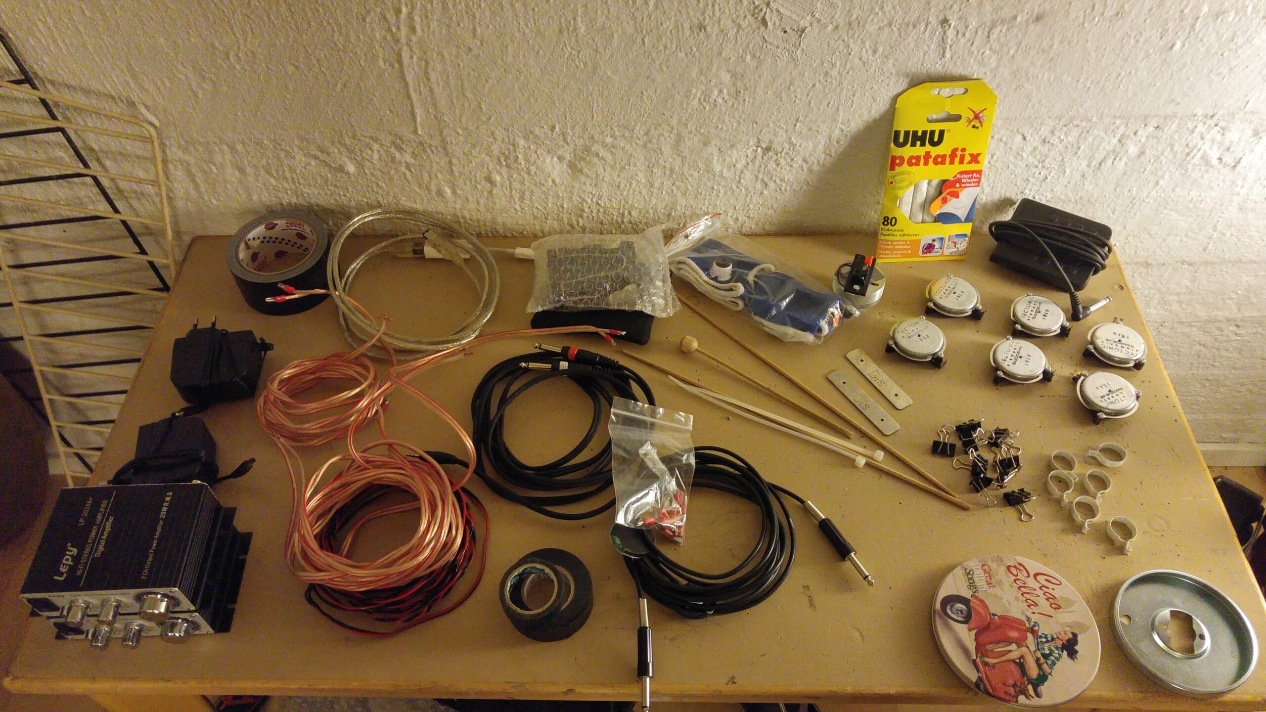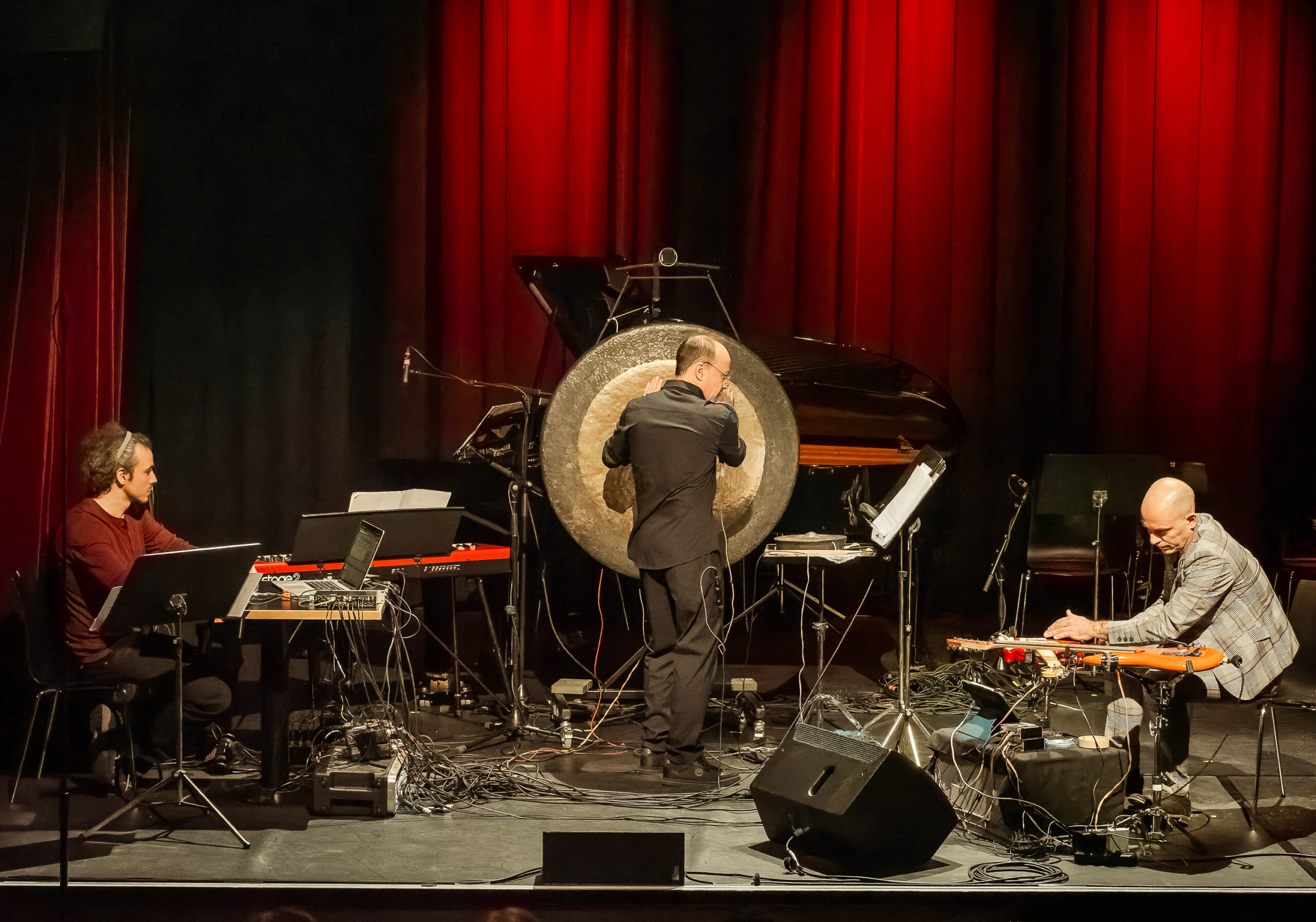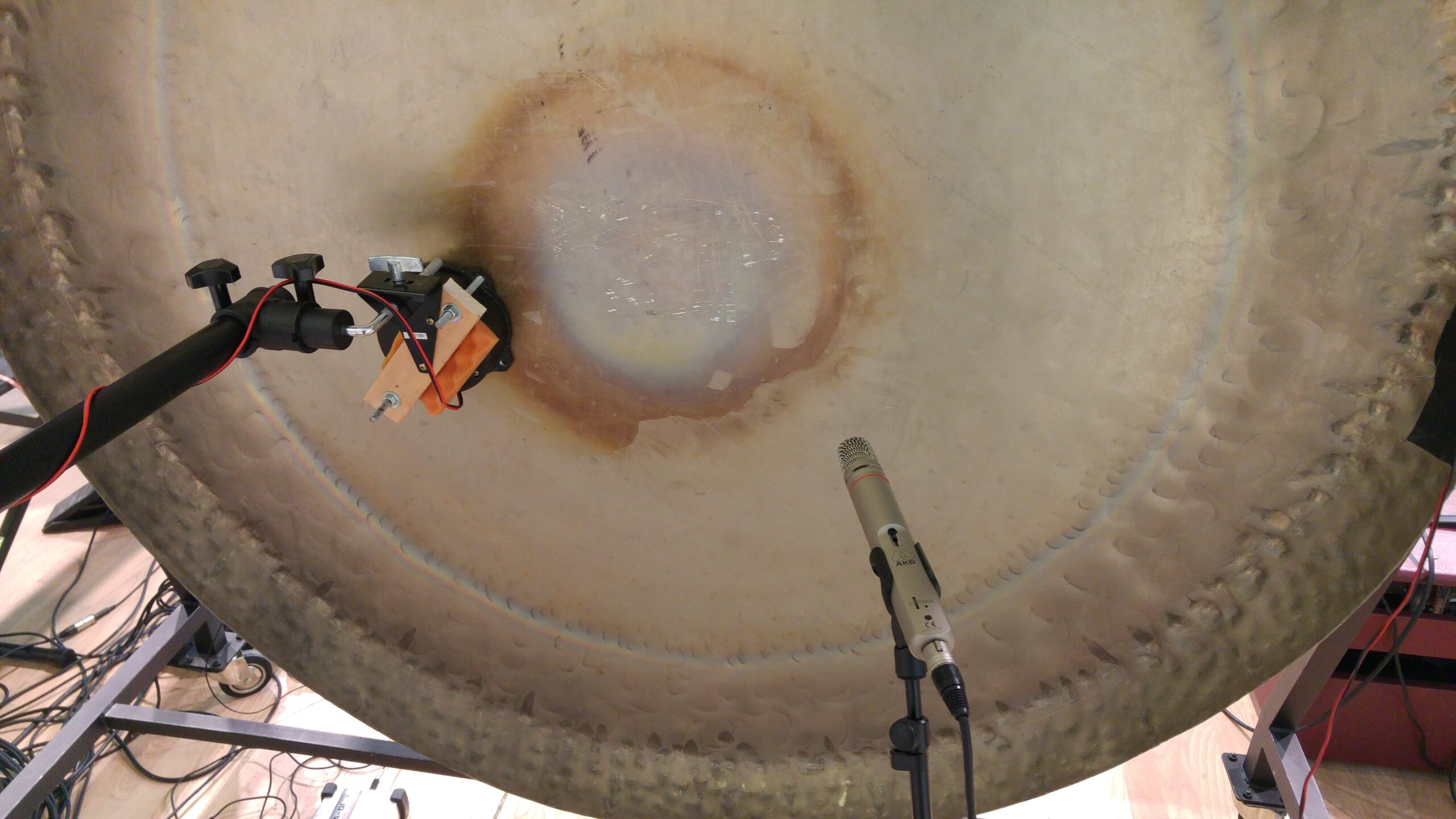 A trio for actuated tabletop electric guitars, tam-tam, and electronics. The instruments are augmented with DIY electro-mechanical systems that allow sustained sound through feedback. This setup alters the instruments’ behavior, bypassing traditional performance techniques and requiring a process of research of new modes of interaction together with the performers. The piece explores the instability of feedback as a compositional tool, where small physical changes in the setup, different instrument exemplars in the hands of different performers can produce radical sonic transformations.