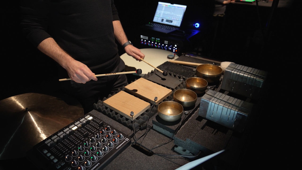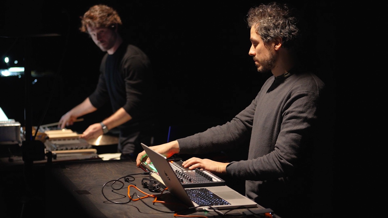 The final chapter of the Autophagy cycle composed togheter with percussionist Tom De Cock for micropercussion – De Cock’s custom instrument – and live electronics. The work, in between a piece and an installation is modular and designed to be performed in different configurations depending on the place of performance. The two musicians perform together with an installation of up to sixteen feedback instruments between actuated cymbals and drums spread around the audience and creating an immersive sonic environment. The work continues the cycle’s exploration of self-regulating acoustic systems electroacoustic lutherie and unstable DIY instruments. It was premiered at Concertgebouw Brugge in 2024 and reflects both musicians’ ongoing research.