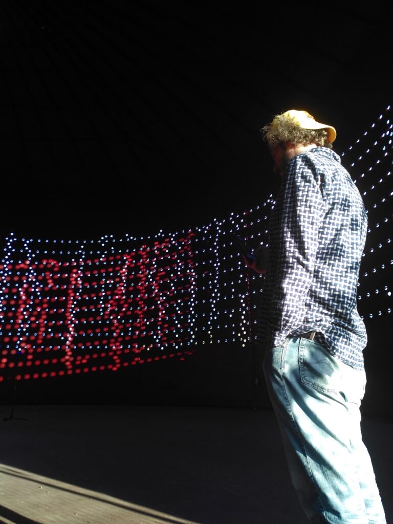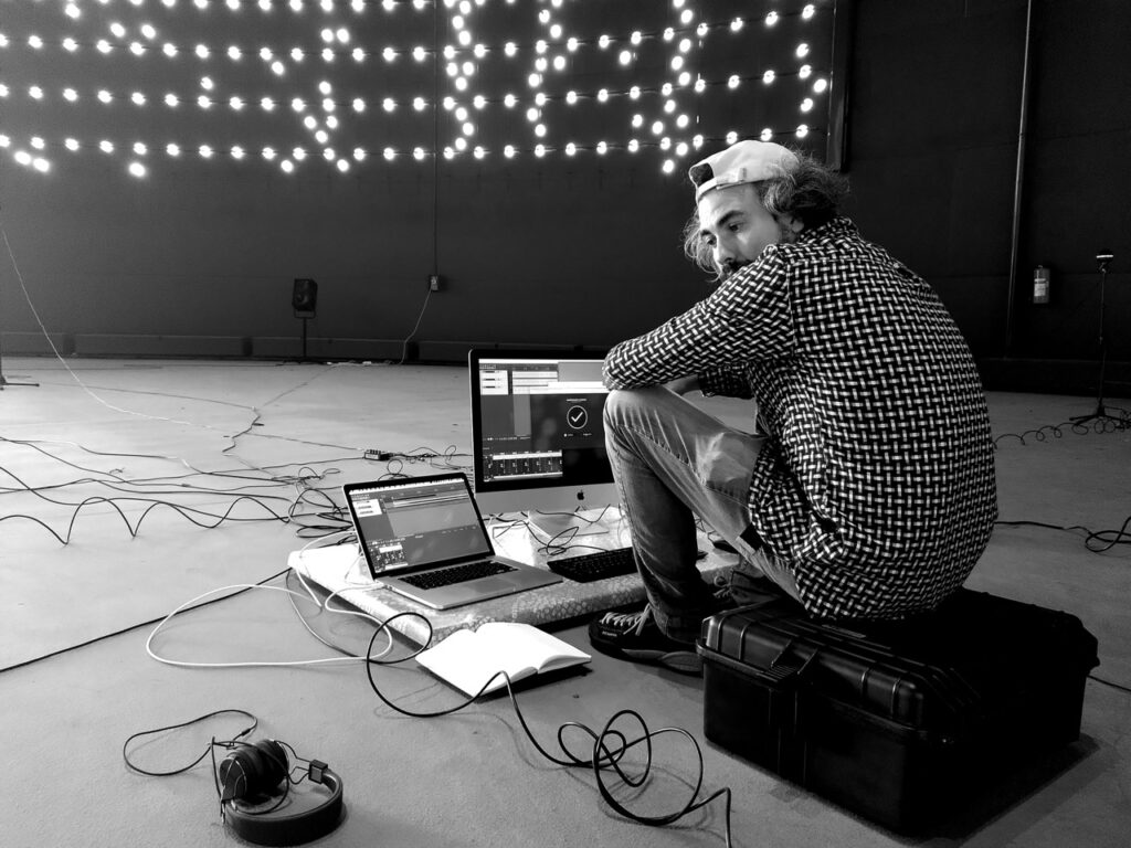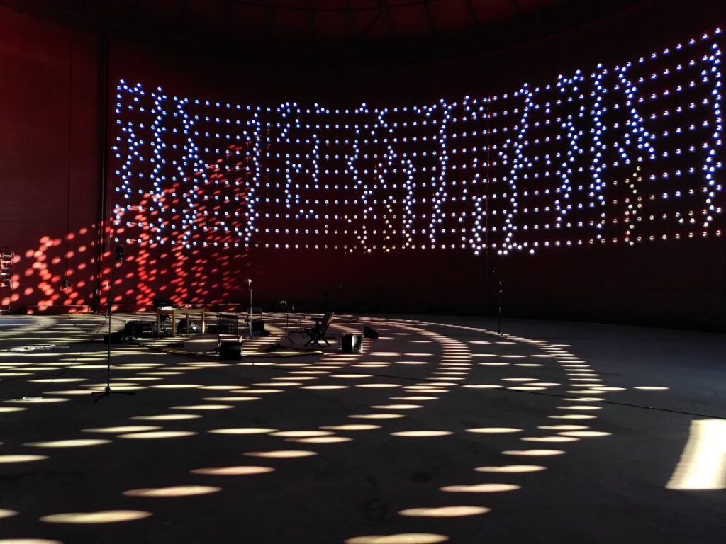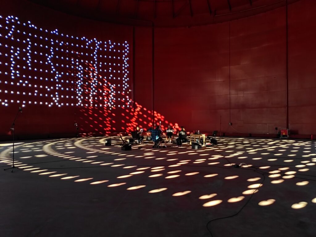 The work features a brass quintet and live electronics, designed to interact with the unique acoustic properties of the space—long reverberation times and location-dependent acoustic phenomena. The piece explores the relationship between sound, architecture, and landscape, incorporating an array of recycled and DIY speakers. Audience movement within the space contributes to the sonic experience, creating a dynamic and evolving acoustic environment. The performance is structured to accompany the transition from daylight to darkness, integrating with the venue’s permanent light installation.